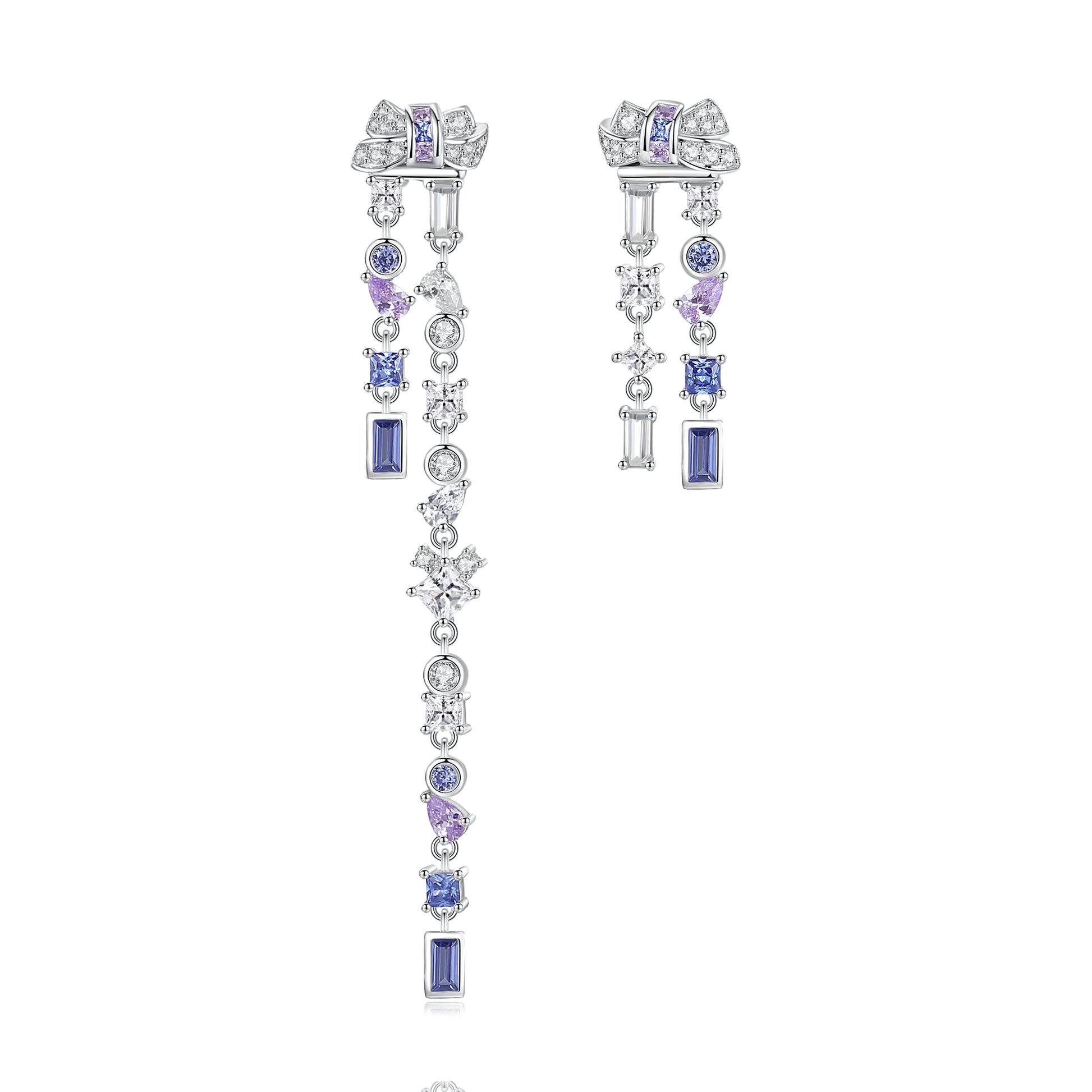 Rhodium-plated silver dangle earrings with multi-cut Cubic Zirconia. Add a touch of charm and color to your style with these playful drop earrings. Featuring asymmetrical strands of vibrant, multi-cut gemstones set in polished rhodium, they’re perfect for a luxe, modern look.