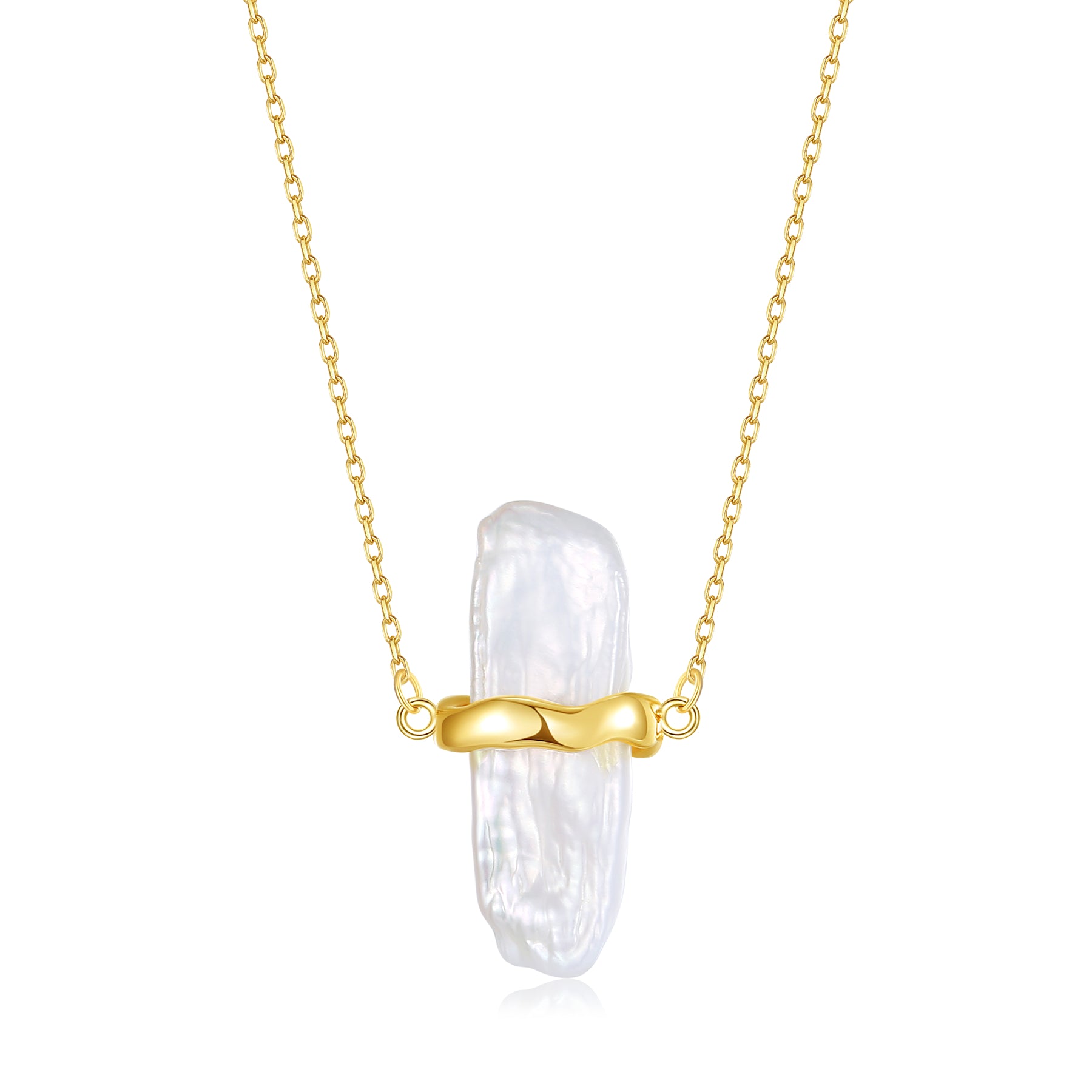 A 14k gold-plated Necklace with a hanging baroque pearl radiates natural elegance and modern artistry. The elongated pearl’s unique shape pairs beautifully with the warm 14k gold-plated accent, creating a refined yet distinctive look. Perfect for those who value individuality and timeless sophistication, this piece effortlessly elevates both casual and formal styles.